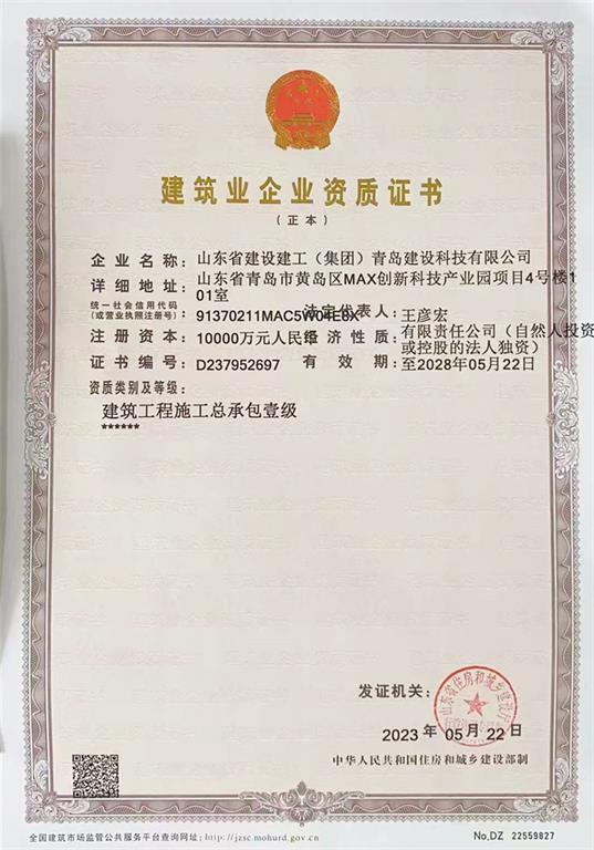集團青島建設科技有限公司獲批建筑工程施工總承包壹級資質